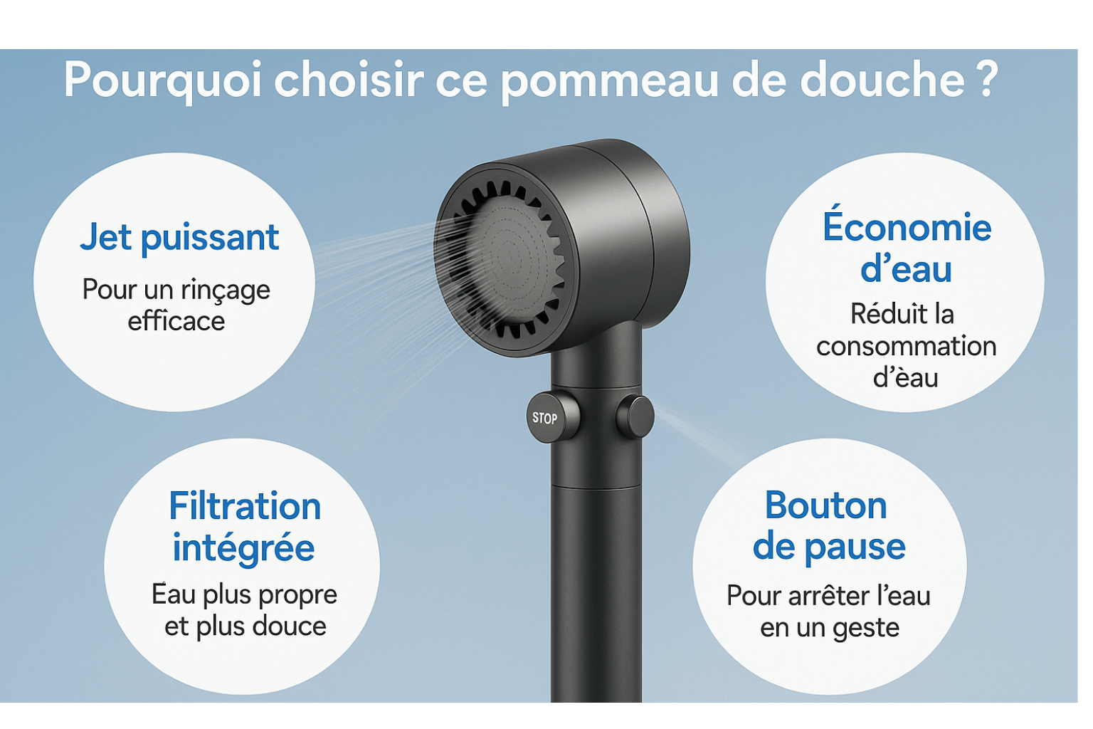 Produits de bonne qualité, finition simple et efficace. 3 filtres fournis. Le bouton pour switcher sur les 3 modes de jets est pratique. Les picots de massages ont bien été appréciés par mon fils. Flexible d’1m 50 avec joints, de bonne qualité et coordonné à la couleur du pommeau. Support mural adhésif fournis. Accessoires, parfait pour la salle de bain.